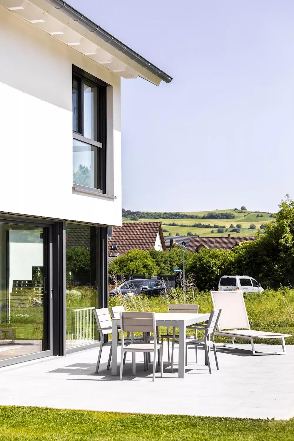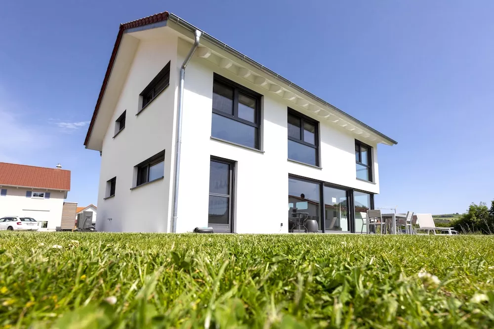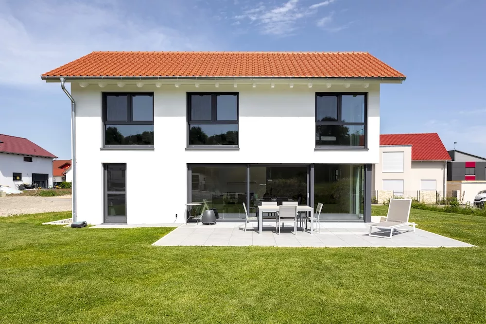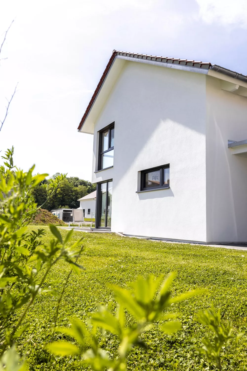 Modern und zeitlos präsentiert sich dieses Einfamilienhaus mit einem asymmetrischen Giebel. Besonders auffällig ist die große Fensterfront mit Eckfenster zur Terrasse, die das Innere mit Licht durchflutet und ein offenes Wohngefühl schafft. Insgesamt sorgen viele bodentiefe Fenster dafür, dass Helligkeit und Großzügigkeit jeden Raum prägen.
