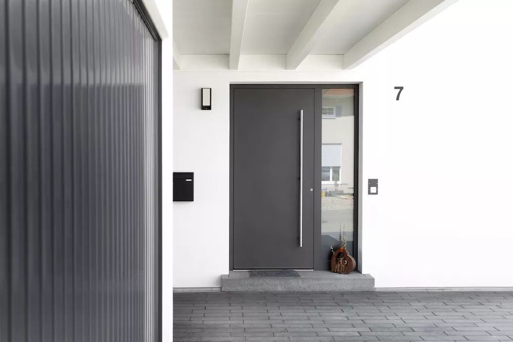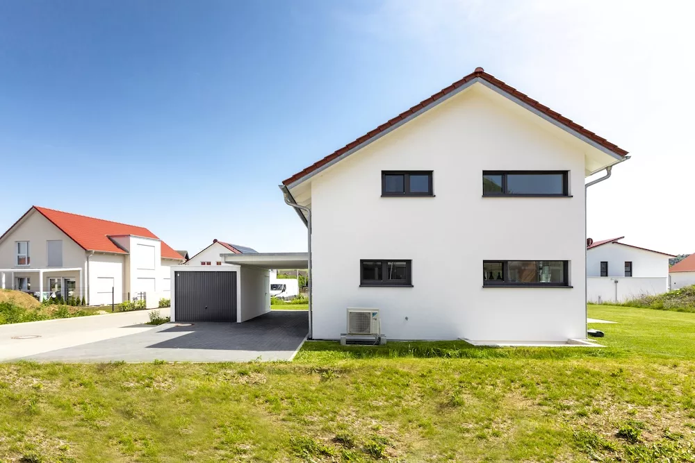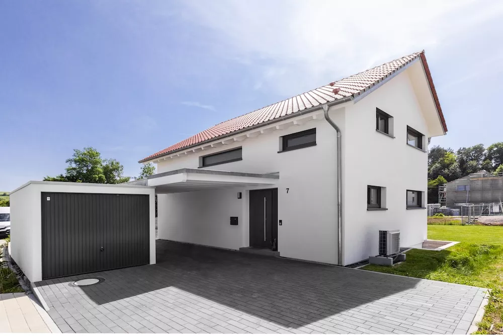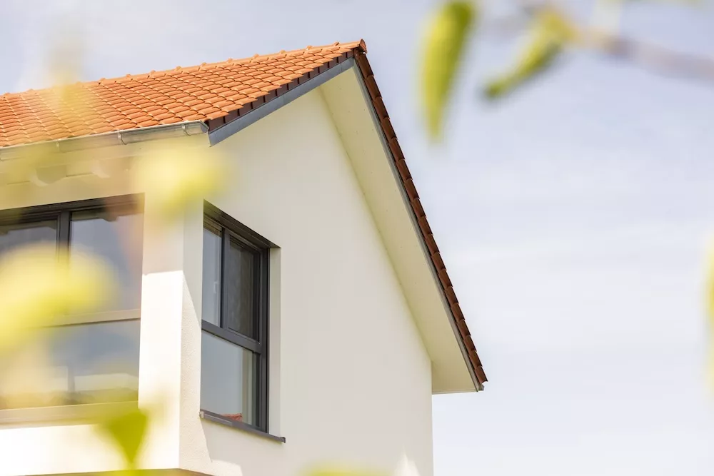 Modern und zeitlos präsentiert sich dieses Einfamilienhaus mit einem asymmetrischen Giebel. Besonders auffällig ist die große Fensterfront mit Eckfenster zur Terrasse, die das Innere mit Licht durchflutet und ein offenes Wohngefühl schafft. Insgesamt sorgen viele bodentiefe Fenster dafür, dass Helligkeit und Großzügigkeit jeden Raum prägen.