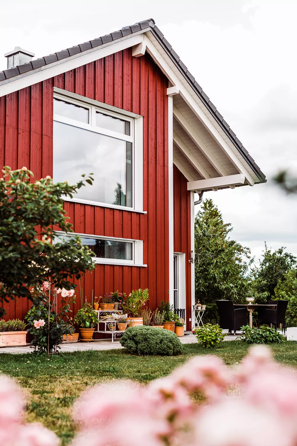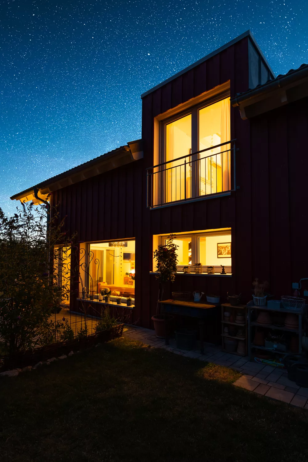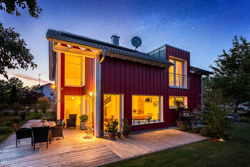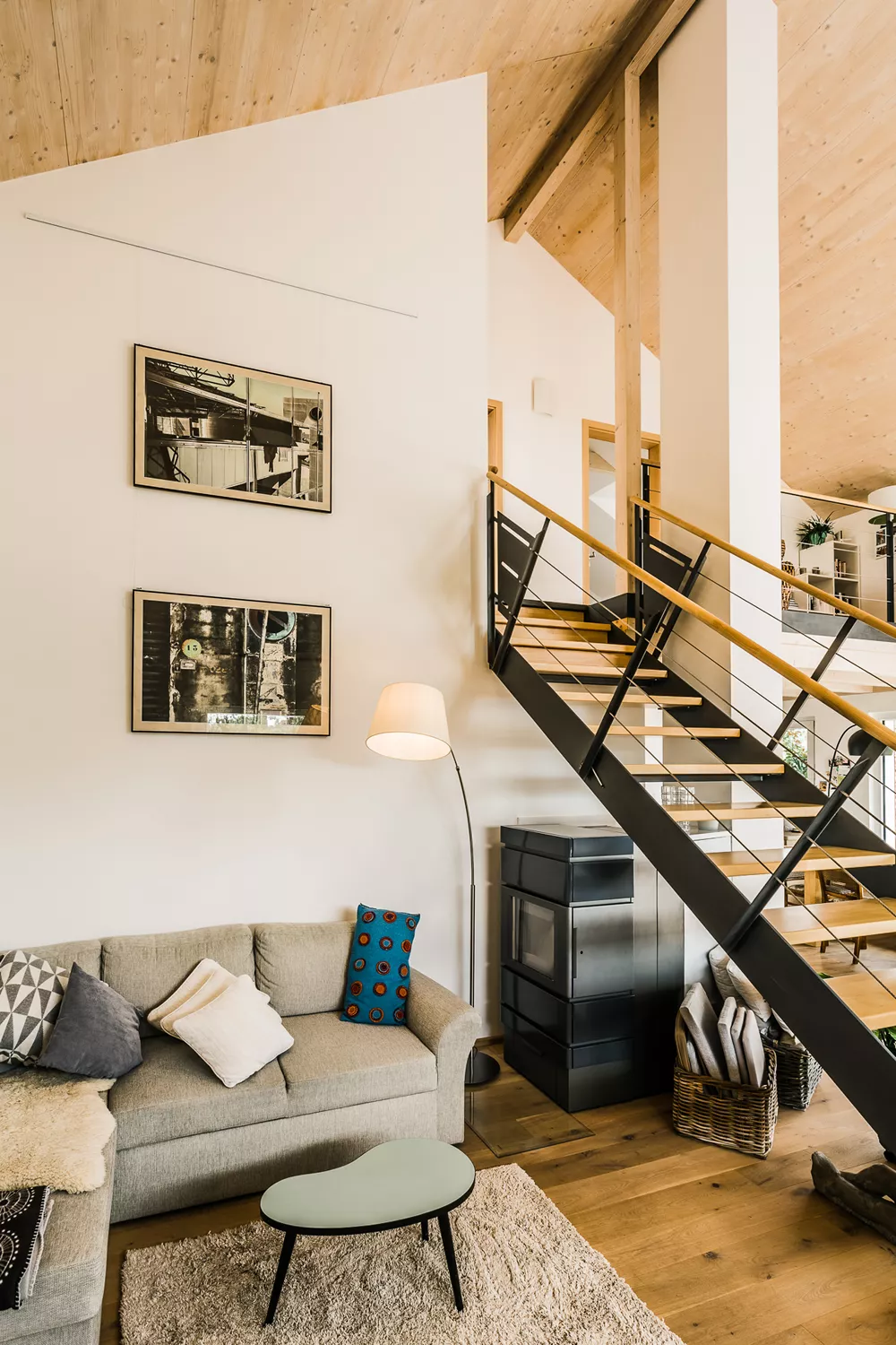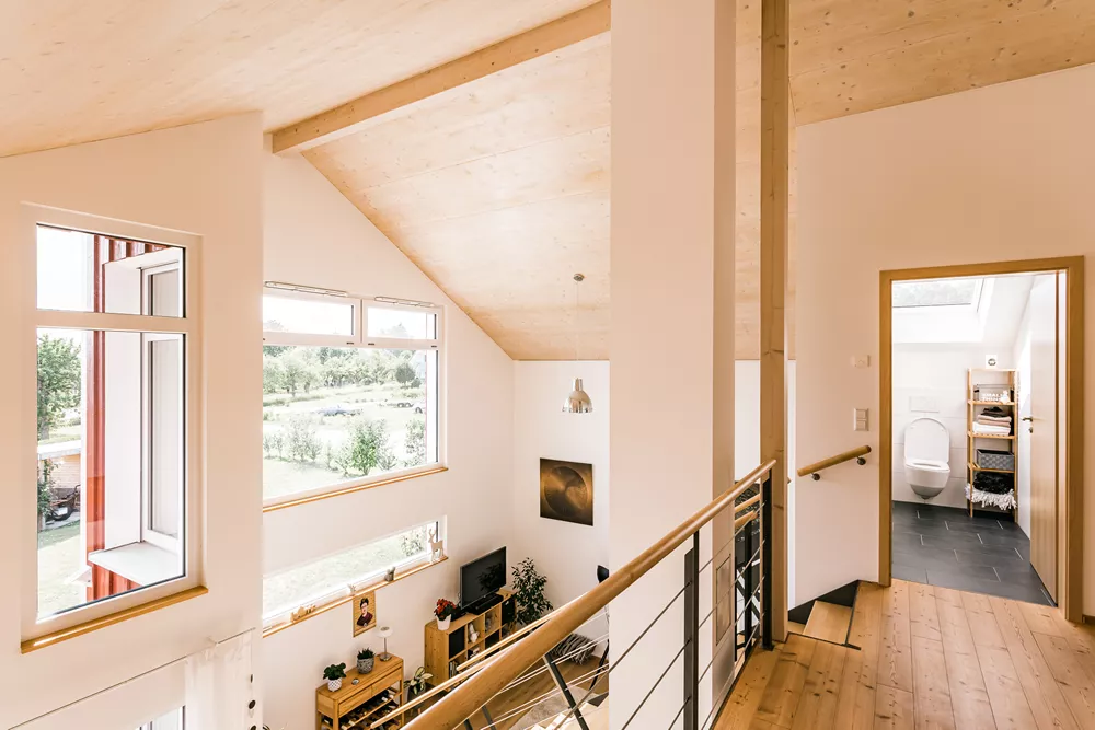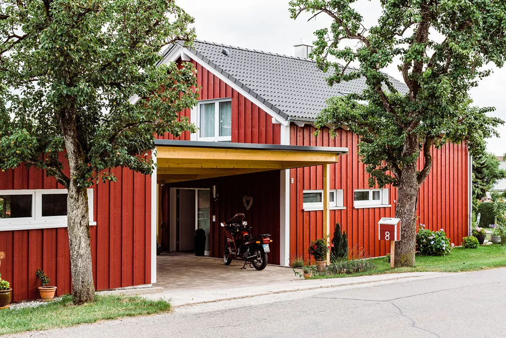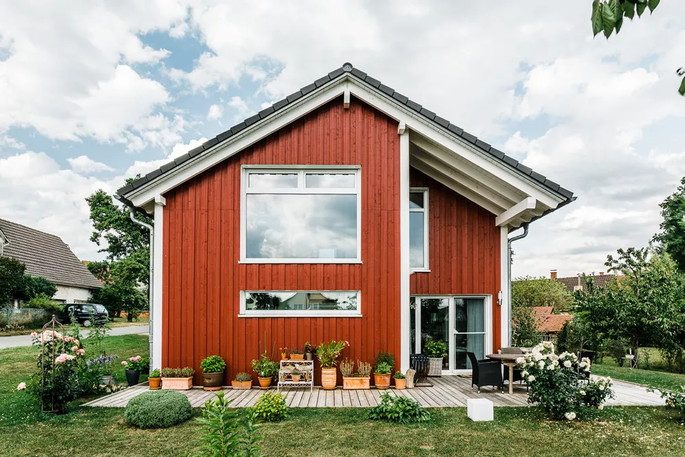 Dieses besondere Holzhaus könnte auch auf einem Felsen in den schwedischen Schären stehen. Das für zwei bis drei Personen optimierte Haus wurde auf ein außergewöhnliches Restgrundstück geplant und sehr individuell an die Wünsche der Bauherrschaft angepasst. Ein Highlight der Ausstattung ist sicherlich der zentrale Ofen, der sowohl mit Pellets als auch Stückholz befeuert werden kann und die gesamte Wärmeversorgung des Hauses übernimmt.