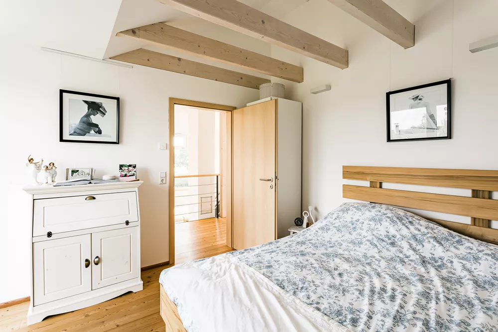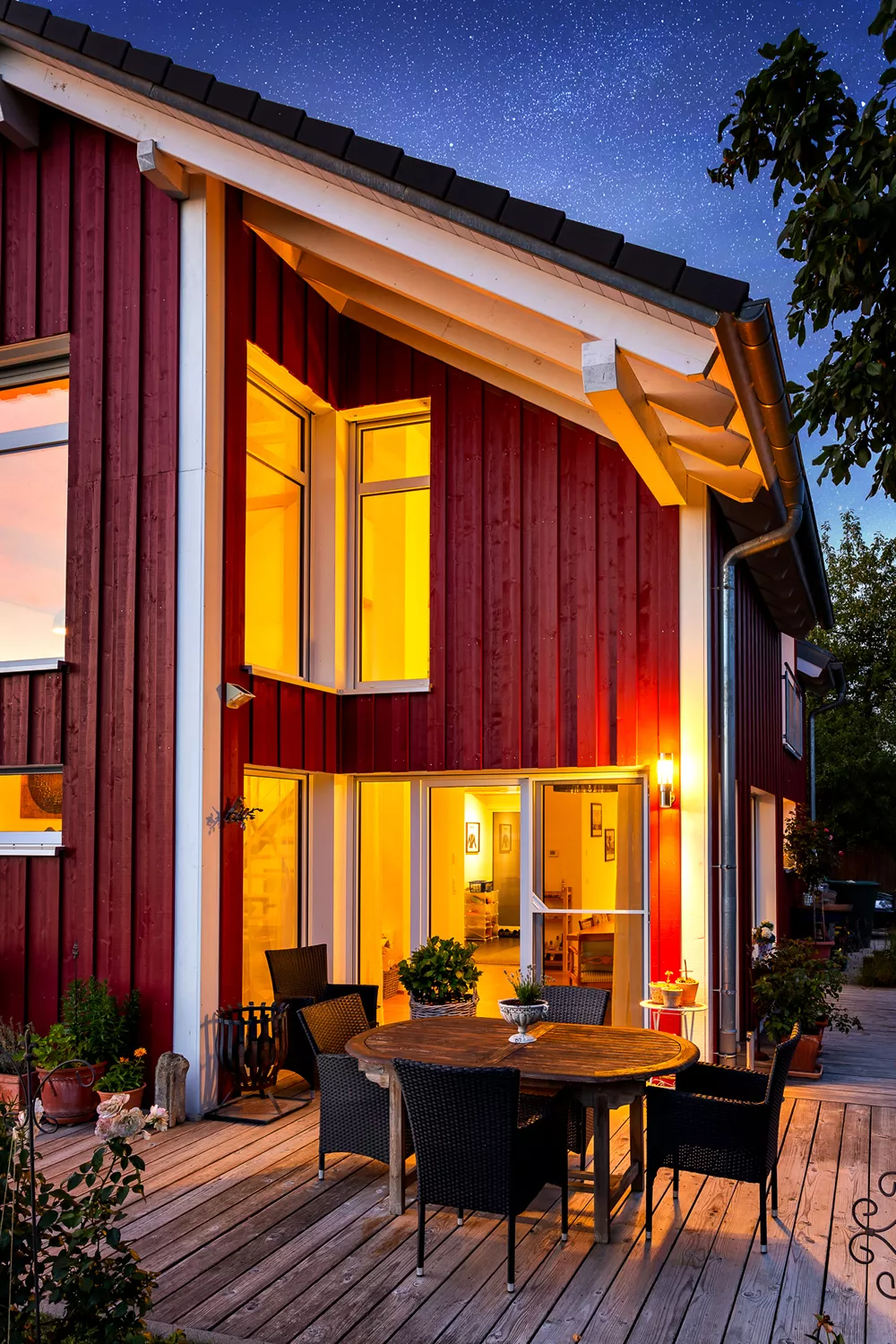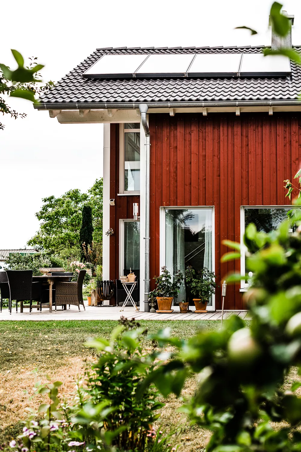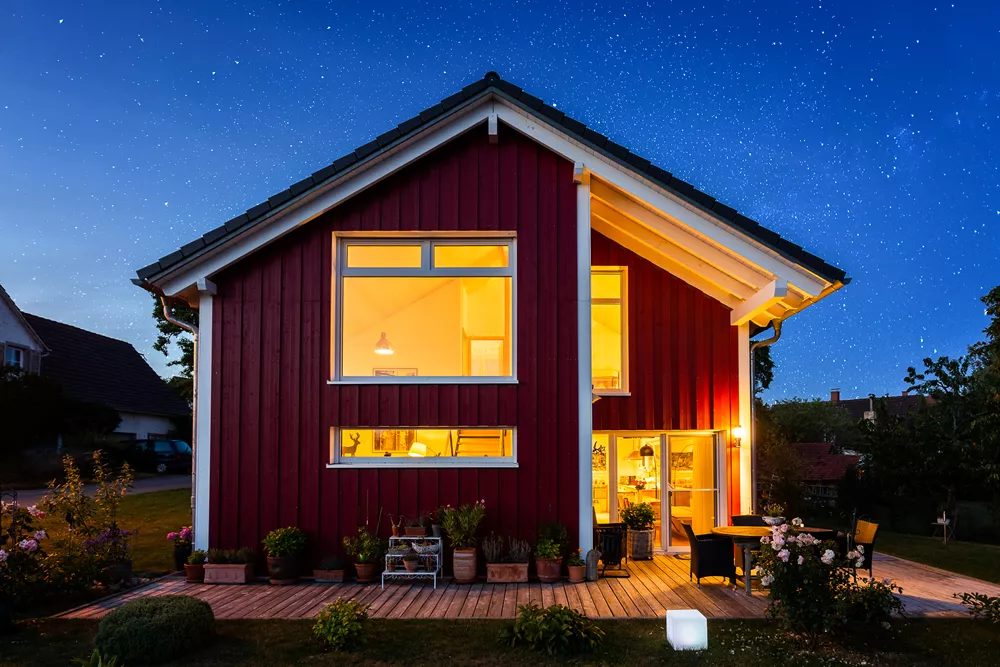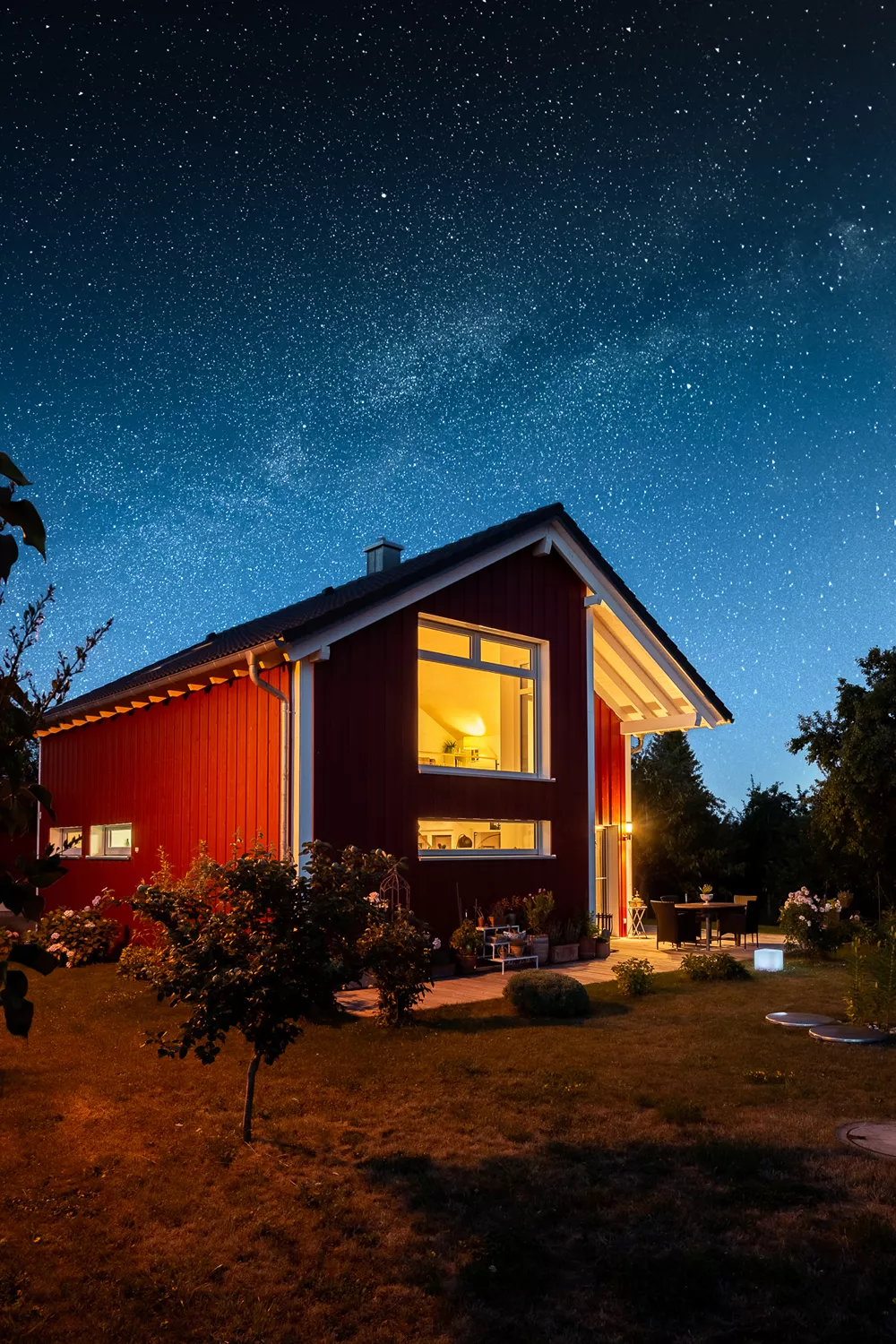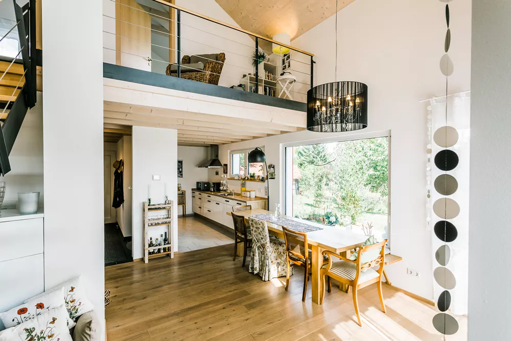 Dieses besondere Holzhaus könnte auch auf einem Felsen in den schwedischen Schären stehen. Das für zwei bis drei Personen optimierte Haus wurde auf ein außergewöhnliches Restgrundstück geplant und sehr individuell an die Wünsche der Bauherrschaft angepasst. Ein Highlight der Ausstattung ist sicherlich der zentrale Ofen, der sowohl mit Pellets als auch Stückholz befeuert werden kann und die gesamte Wärmeversorgung des Hauses übernimmt.