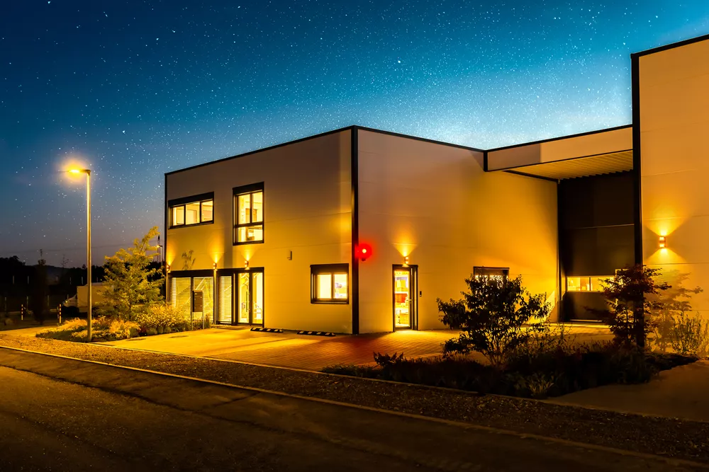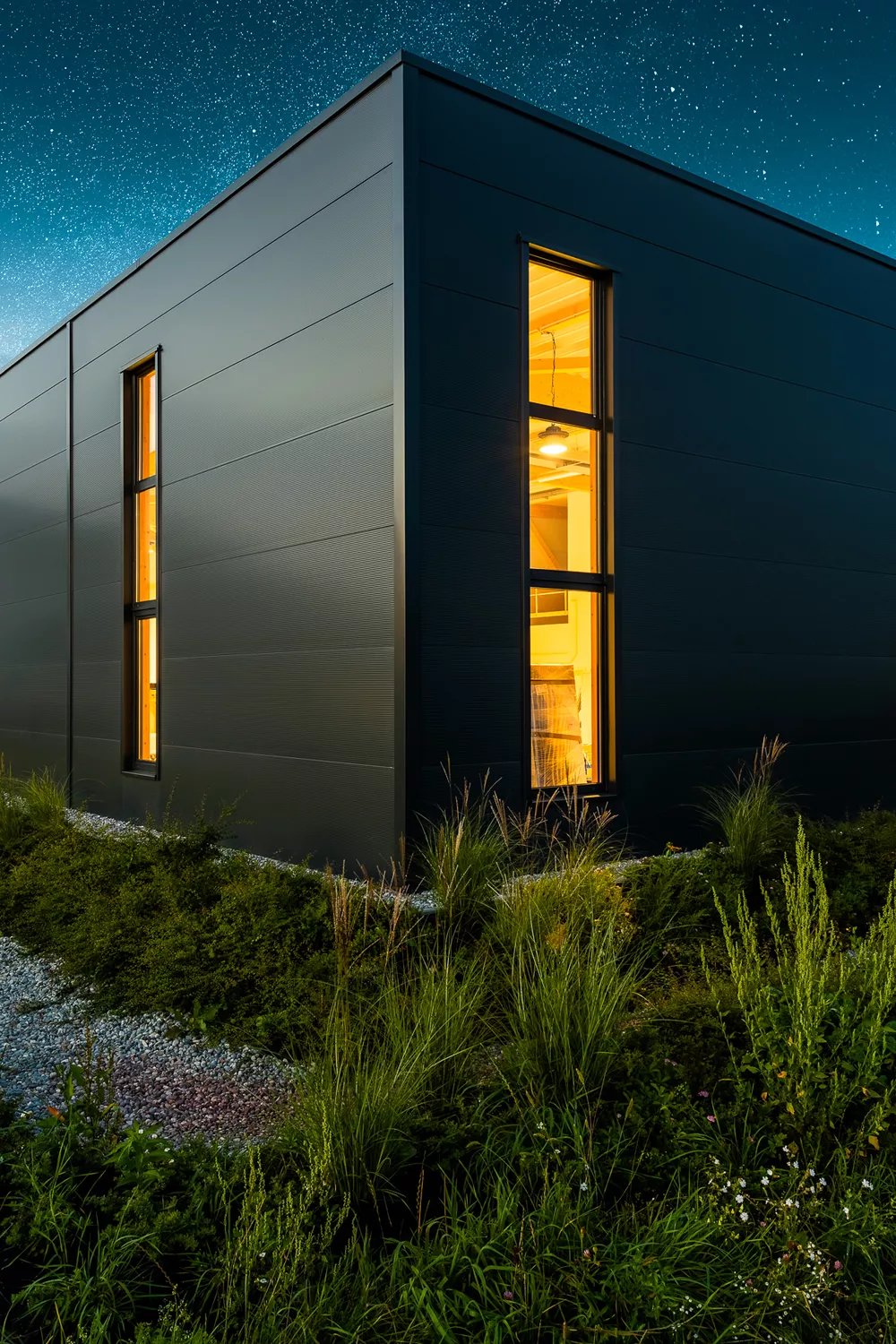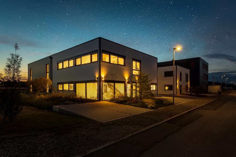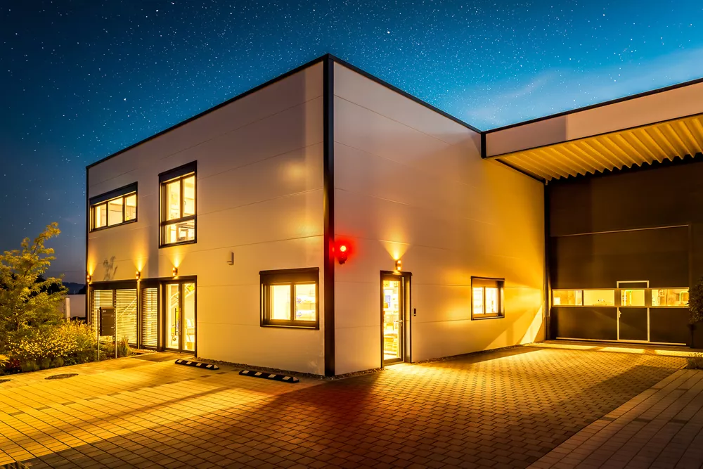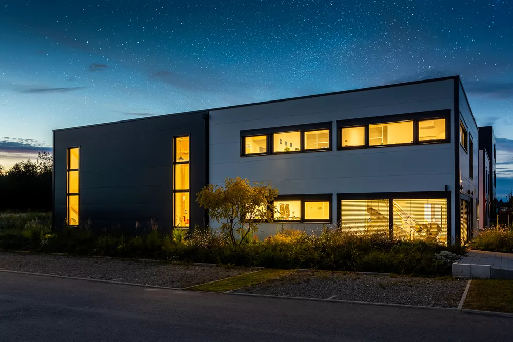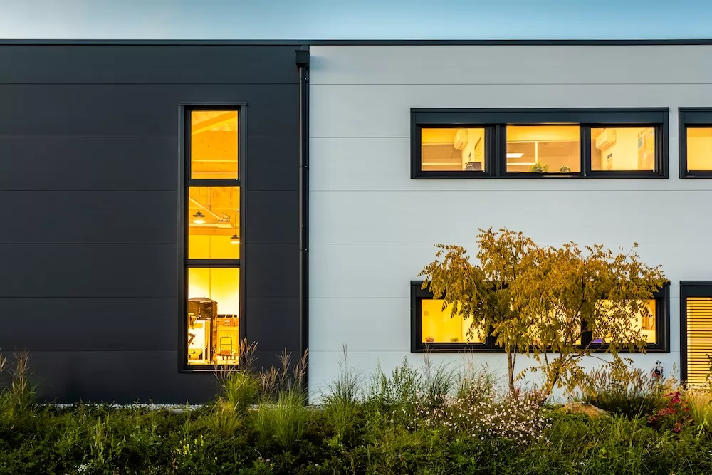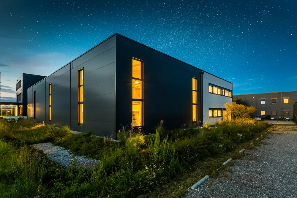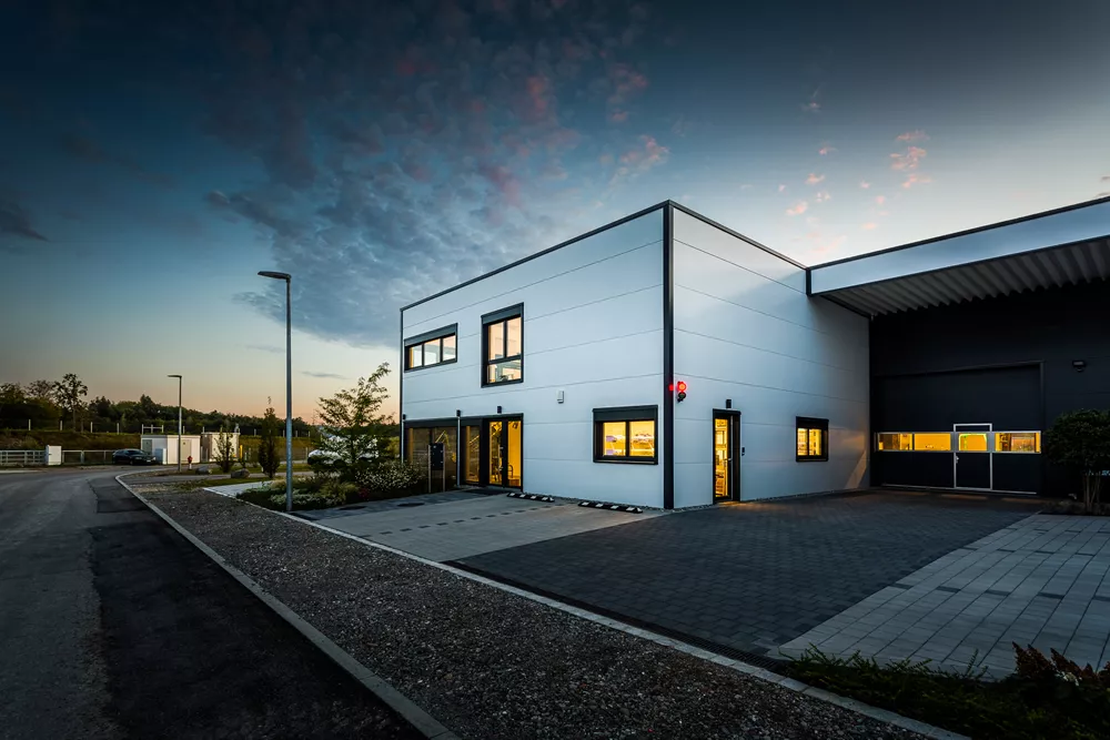 Dass Zweckmäßigkeit und Ästhetik sich nicht ausschließen, beweist dieser Gewerbebau mit zwei separaten Bürotrakten und Lagerhallenteilen. Der anthrazit und weiß verkleidete Baukörper nutzt das Grundstück ideal aus. Im Innenraum genießen die Mitarbeiter ein modernes und schönes Arbeitsumfeld sowie besonders angenehme Deckenhöhen im ersten Stock. Von Anfang an wichtig und eingeplant wurden die Wachstumsmöglichkeiten, die zu sehr wirtschaftlichen Rahmenbedingungen realisiert werden konnten.