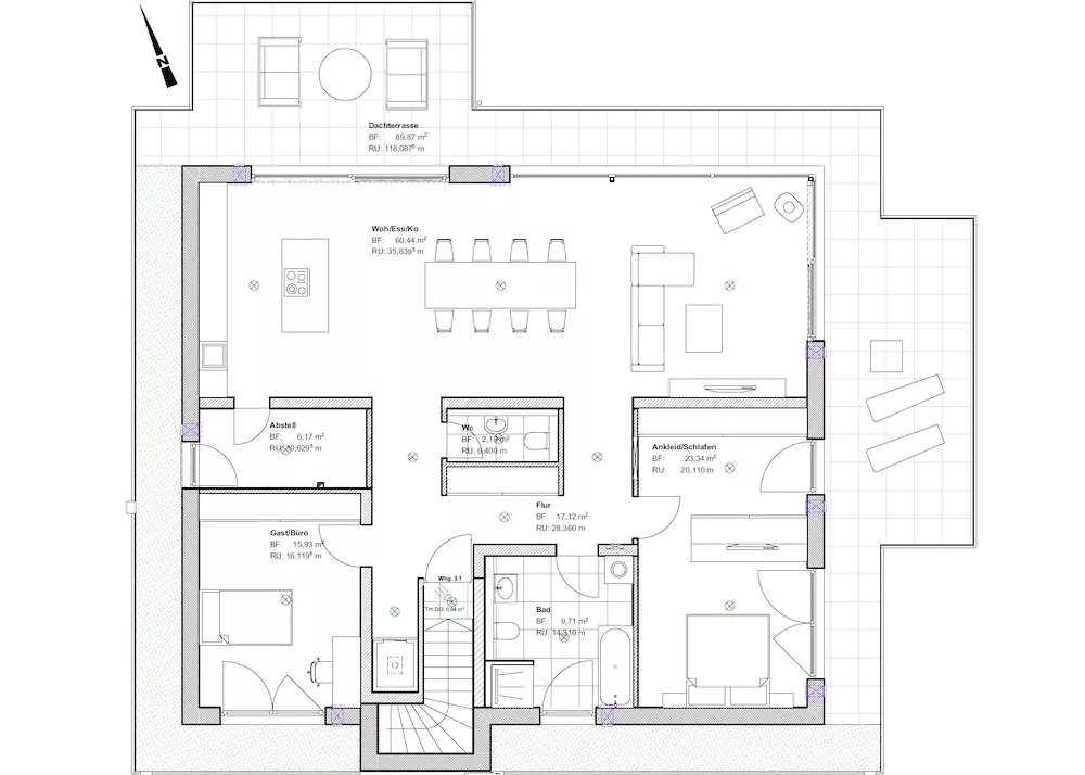 Die Ausstattung erfüllt höchste Ansprüche: In allen beheizten Räumen sorgt eine Fußbodenheizung für angenehmes Wohnklima, während hochwertiges Eiche-Massivparkett in den Wohnbereichen eine warme, natürliche Atmosphäre schafft. Große Fensterflächen mit Schiebetüren führen auf die umlaufende Dachterrasse, die großen Fenster sind zudem mit elektrischen Rollläden ausgestattet, die besonderen Komfort bieten. Der Abstellraum ist mit einem pflegeleichten Vinylboden ausgeführt. Das Badezimmer verfügt über eine bodentiefe Dusche sowie zusätzlich über eine Badewanne.